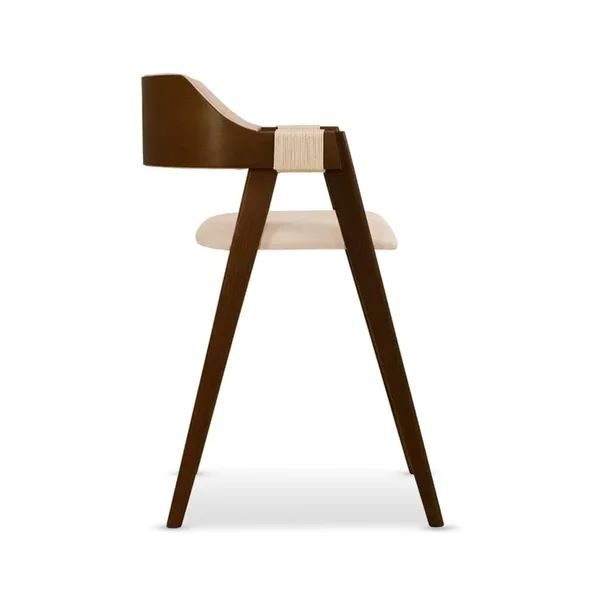 Cód. BANQD13 Banqueta Dália Madeira Maciça Estofada com Apoio de Braço madeira na cor Castanho - Tecido Linho Off-White - Cód: BANQD13