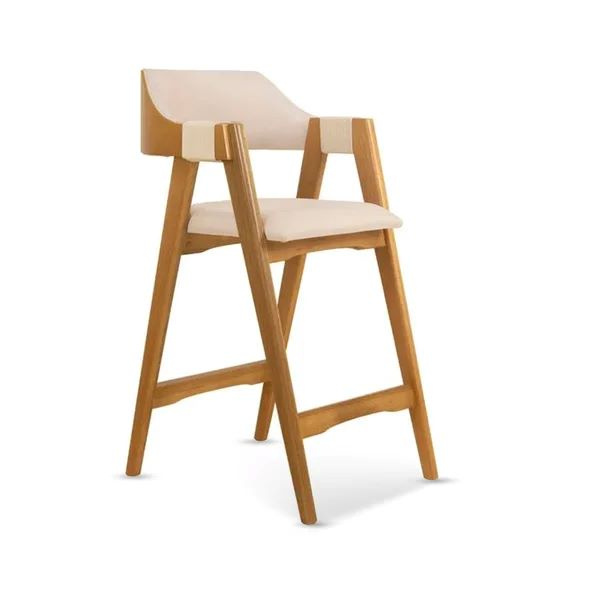 Cód. BANQD12 Banqueta Dália Madeira Maciça Estofada com Apoio de Braço madeira na cor Imbuia - Tecido Linho Off-White - Cód: BANQD12
