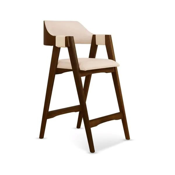 Cód. BANQD13 Banqueta Dália Madeira Maciça Estofada com Apoio de Braço madeira na cor Castanho - Tecido Linho Off-White - Cód: BANQD13